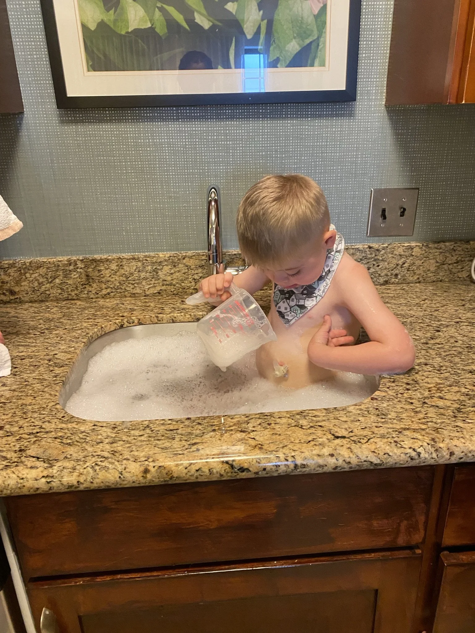 Our hotel didn't have a bathtub so we had to improvise. Sam thought taking a bath in the kitchen sink was great. It was a lot less stressful for Sean and I too, because Sam LOVES the water. If he was able, I think he would have his head under the water all the time. He has no idea what would happed if he completely submerged himself in water. He is very brave around water and is constantly trying to put in head under, which makes bath time and water in general, pretty stressful for us. My heart skips a beat when I think of Sam without a trach and the day he can completely submerge himself in water. I think he will be a fish. Oh happy day.