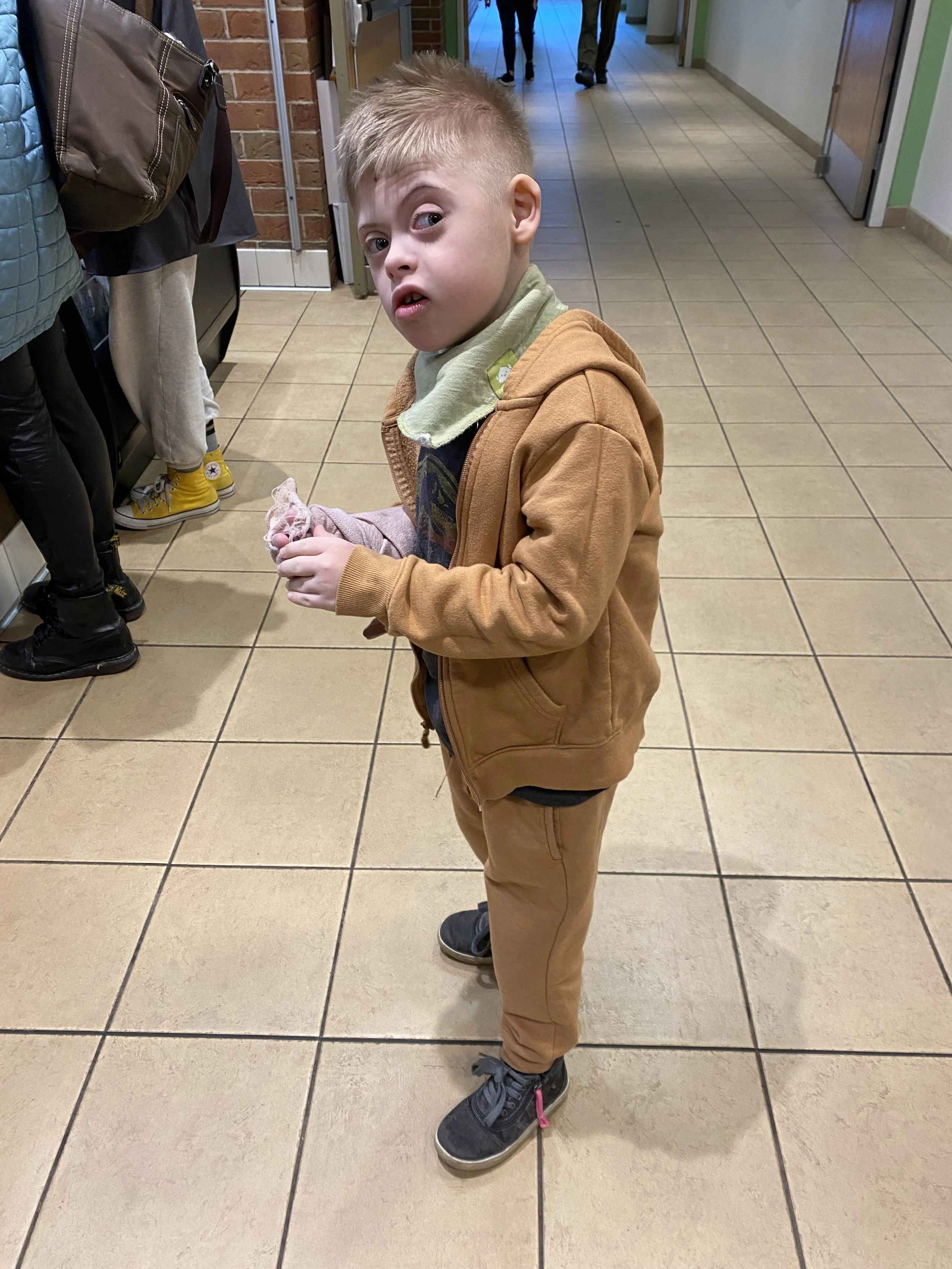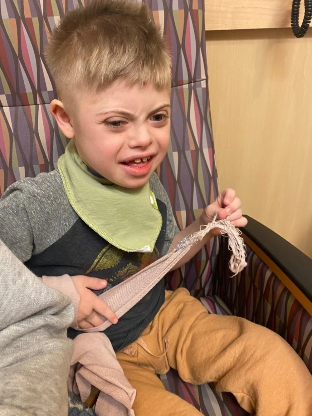 Sam’s PTSD kicked in as soon as we entered the hospital doors. He continually shakes his head, waves his little pointer finger in the air and says, “Uh, uh!” As you probably guessed that means, no. He does a somewhat fake cry, grabs my legs, and burrows his head into my stomach. He lifts his head, points to his arm, grimaces, and says, “Oke.” That means poke. Poor, sweet boy knows exactly what’s coming. The only thing I can do is hug him and tell him, I’m sorry.